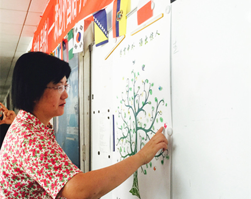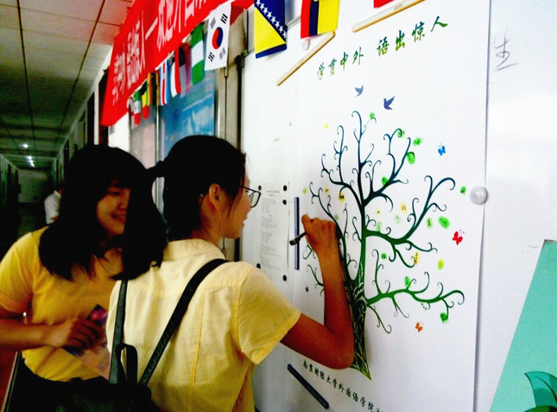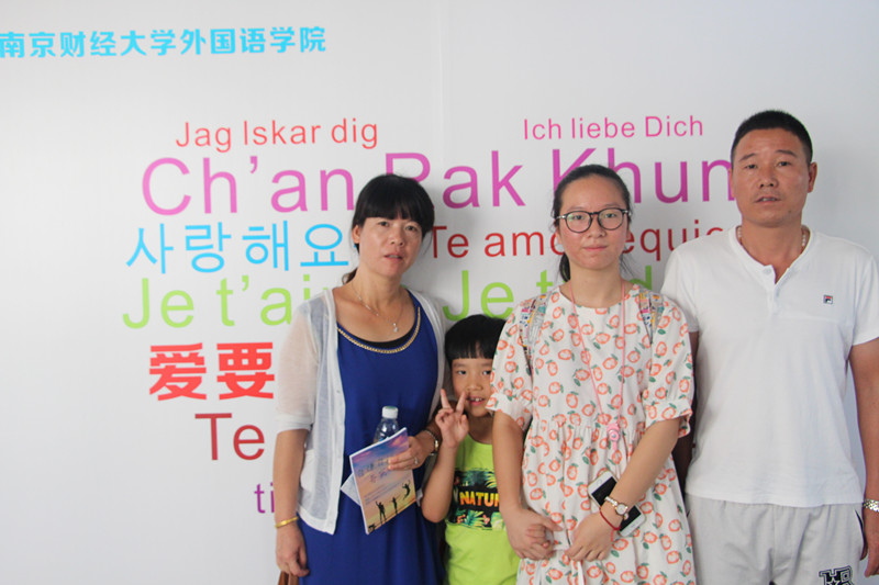 在迎新现场,学院精心悬挂了万国国旗,让语言学习的氛围在新生报到第一天就能感染新生。今年学院在迎新现场引导全体2016级新生“栽种”希望之树,在希望之树的“栽种点”按下全体新生的手纹印,绘制成一棵希望之树,这棵“希望之树”将悬挂在学院走廊,陪伴全体2016级新生度过他们宝贵的四年时光,见证学子的成长,校党委常委、副校长邱伟芬教授也加入到了“栽种”希望之树的行列。此外,学院还组织了为新生及家长拍摄全家福的活动,并倡议新生“爱要大声说出来”,让新生和父母在学院精心制作的背景墙前合影留念,向父母大声说出“我爱你”,纪念大学入学这一特殊的时刻。背景墙别出心裁地使用了十几种语言表达的“我爱你”拼成了心形图案,不仅体现了英国上市公司365浓厚的外语氛围,更寓意着所有2016级新生对父母家人的感恩与爱。
