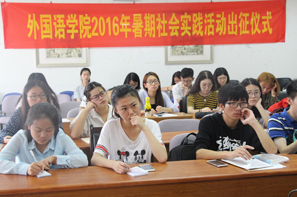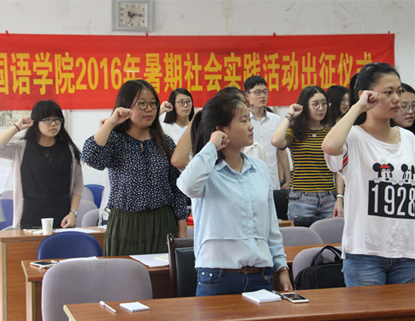 学工办主任薛桂芳宣读了2016年学院暑期社会实践立项团队名单和资助情况,并就财务报销要求对实践团队进行指导;潘华老师对全体团队成员进行安全教育,希望团队能牢牢谨记“安全第一”的思想,始终把安全工作放在首位,各团队队长签署了安全协议书;随后与会嘉宾为暑期实践团队授旗,我院2016年暑期社会实践活动正式启动。院学生会就业实践部部长罗巧同学带领实践团队宣誓,立志完成实践目标,在实践中践行知行合一理念。