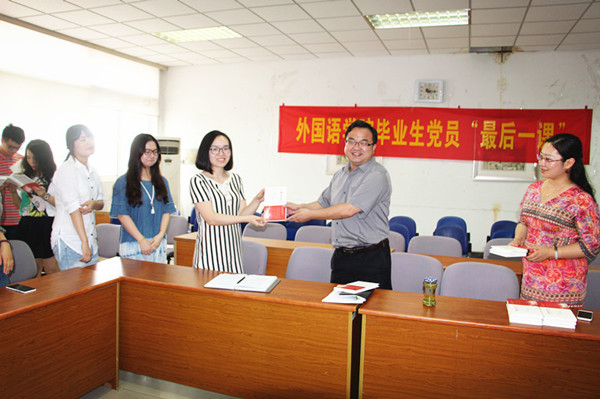 6月19日,我院在法政学科楼308会议室举办2016届毕业生党员“最后一课”。党课开始前,毕业生党员们在图书馆前面对党旗庄严地举起右拳,由党员王磊同学领誓,一起重温了入党誓词。在最后一次党课上,学院党委刘浩书记叮嘱毕业生党员在未来的日子里,要时刻谨守自己党员的身份,主动承担一名党员应当承担的责任,坚定为党的事业、为祖国的建设奋斗终身的崇高理想。学院还向全体毕业生党员赠送了南京航空航天大学徐川同志的著作《节节向上》,希望毕业生党员在毕业后的工作生活节节向上,永葆党性,永远充满正能量。