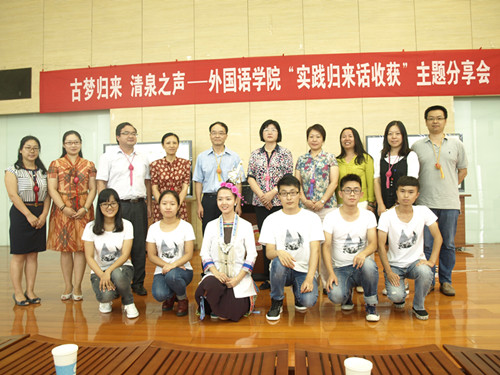 古梦清泉侗族文化传承志愿团由英语1302班石贤同学于2014年暑期发起,先后参与过“挑战杯”大学生课外学术科技作品竞赛、大学生创新创业训练计划,并获得江苏省大学生创新创业训练项目省级指导立项,同时该团队为今年暑期社会活动省级立项和校级重点立项团队。今年他们以贵州省从江县西山镇陡寨村为基地,依托西山中心小学邀请老歌师传授侗族大歌,开办少年侗歌班,继续深入开展侗族文化传承实地研究。