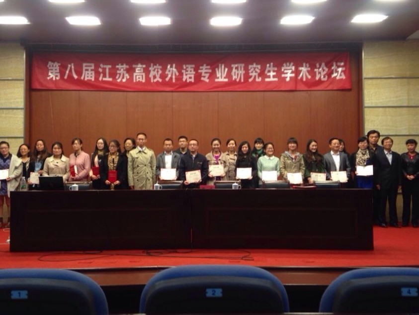 此次学术论坛由江苏省高等学校外国语教学研究会主办、江苏省高等学校外国语教学研究会主办,包括南京大学研究生院常务副院长许钧教授、江苏省高等学校外国语教学研究会会长李宵翔教授在内的近10位著名专家和来自省内18所高校的外语学院领导、带队教师以及200余名研究生参加了本次论坛。在专家报告后,论坛分为大会发言和小组讨论两部分,参会研究生分别从语言学、文学、翻译三个方面进行了学术交流。我院师生分别在各自方向的分论坛大会上发言,并获得评审老师的好评,在众多参赛者中脱颖而出,顾晓燕博士获得二等奖,陈瑾和江汝镠同学获三等奖。