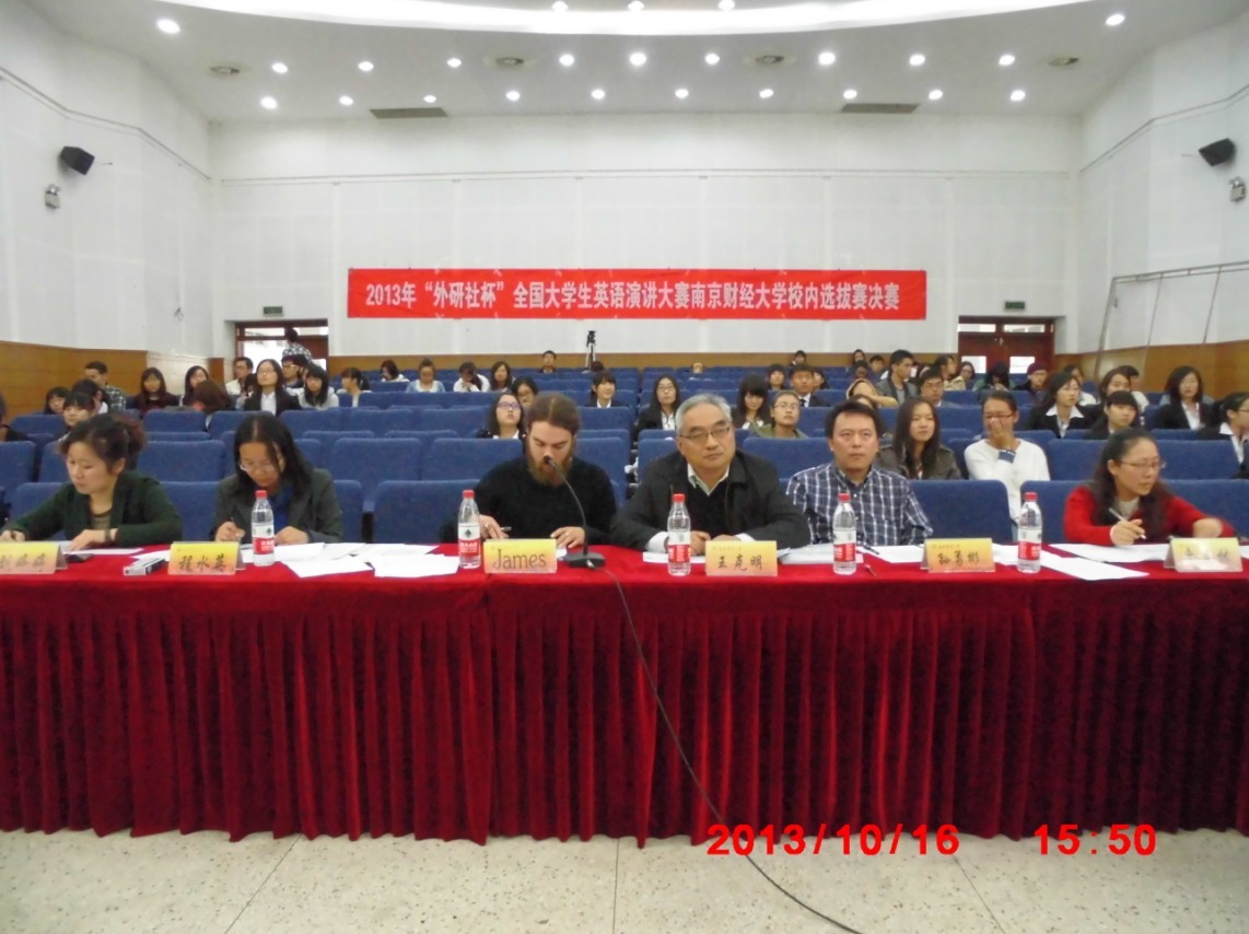 英国上市公司365院长王克明教授、副院长孙勇彬教授、团总支书记金立林老师,基础英语教研室主任刘婷婷老师,负责外事工作的程水英老师和外籍教师James担任大赛评委。本次大赛分为两个部分,一部分是三分钟的自主演讲,主题依然是预赛的“当苏格拉底遇上孔夫子”,而第二部分则是外教提问环节,参赛选手回答外教的问题,以此来作为评分的标准。
