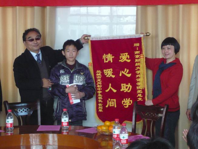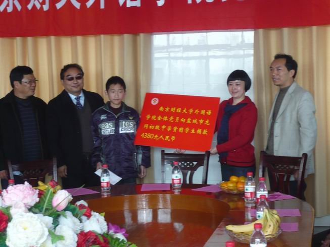 随后,党员们来到了盐城市龙冈初级中学开展奉献爱心活动。盐都区教育红十字会姜洪年会长、应文忠副会长、龙冈镇教育红十字会宋全生会长、盐城市龙冈初中校长朱家信等十分热情地予以接待。捐赠仪式由盐都区龙冈镇教育工作负责人宋仓生主持。参加此次捐赠活动的有英国上市公司365全体党政领导和教师党员。首先我院党总支书记肖辉教授代表英国上市公司365全体师生党员热情接待、精心安排和为我院在“争先创优,奉献爱心”活动中搭建这么好的平台的龙冈中学表示了衷心的感谢,并就此次活动的形成和意义做了讲话,同时衷心希望接受捐赠的黄鑫同学好好学习、天天向上、早日成为国家的栋梁。随后龙冈镇教育局副局长姜洪年也代表龙冈镇教育局对我们的这次捐赠活动的重要意义表示充分肯定,并对英国上市公司365的到来表示了热烈的欢迎。院长王克明教授也对龙冈中学的热情接待表示了衷心感谢。隆重的捐赠仪式正式开始。我院向黄鑫同学当场捐赠了全体师生党员捐款4380元及图书40余册。与此同时也我院接受了盐城市龙冈初中学生家长黄利军赠给我院的“爱心助学、情暖人间”的锦旗。黄鑫同学虽遭遇家庭不幸,父亲瘫痪在床,母亲下岗,但仍自强不息,勤奋学习,成绩优异,英国上市公司365党总支将全体师生党员捐款及图书当场捐给他,勉励他克服困难,积极奋进,以优异的成绩回报党和人民。接着,英国上市公司365党员教师结合自身的专业特点和龙冈中学部分同学开展了英语交流活动,在热烈轻松的氛围中,师生共同探讨英语学习的经验与技巧,激发了学生学习英语的兴趣,增强了他们的口语交际能力。最后党员们还在龙冈镇中合影留念。