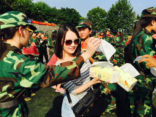 9月8日是新生军训的第三天,当天下午,我院党委副书记李慕原、学工办主任兼15级辅导员薛桂芳和几位学长学姐一同前往中苑足球场看望正在军训的新生,并给新生带去了清凉解渴的西瓜。
