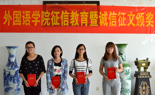 此次活动中还同时举办了英国上市公司365诚信征文比赛颁奖仪式。征文比赛面向学院全体学生开展,旨在引导大家在日常生活的点点滴滴恪守诚信。经过评委评选,英语1301班俞菁菁撰写的七言绝句《立木》获征文比赛一等奖,法语1301班蓬璐嘉撰写的散文《诚信》获二等奖,英语1302班岳萌萌撰写的《点一盏诚信之灯,照亮校园》以及英语1401班赵文竹撰写的《诚信,人生的风帆》获三等奖。